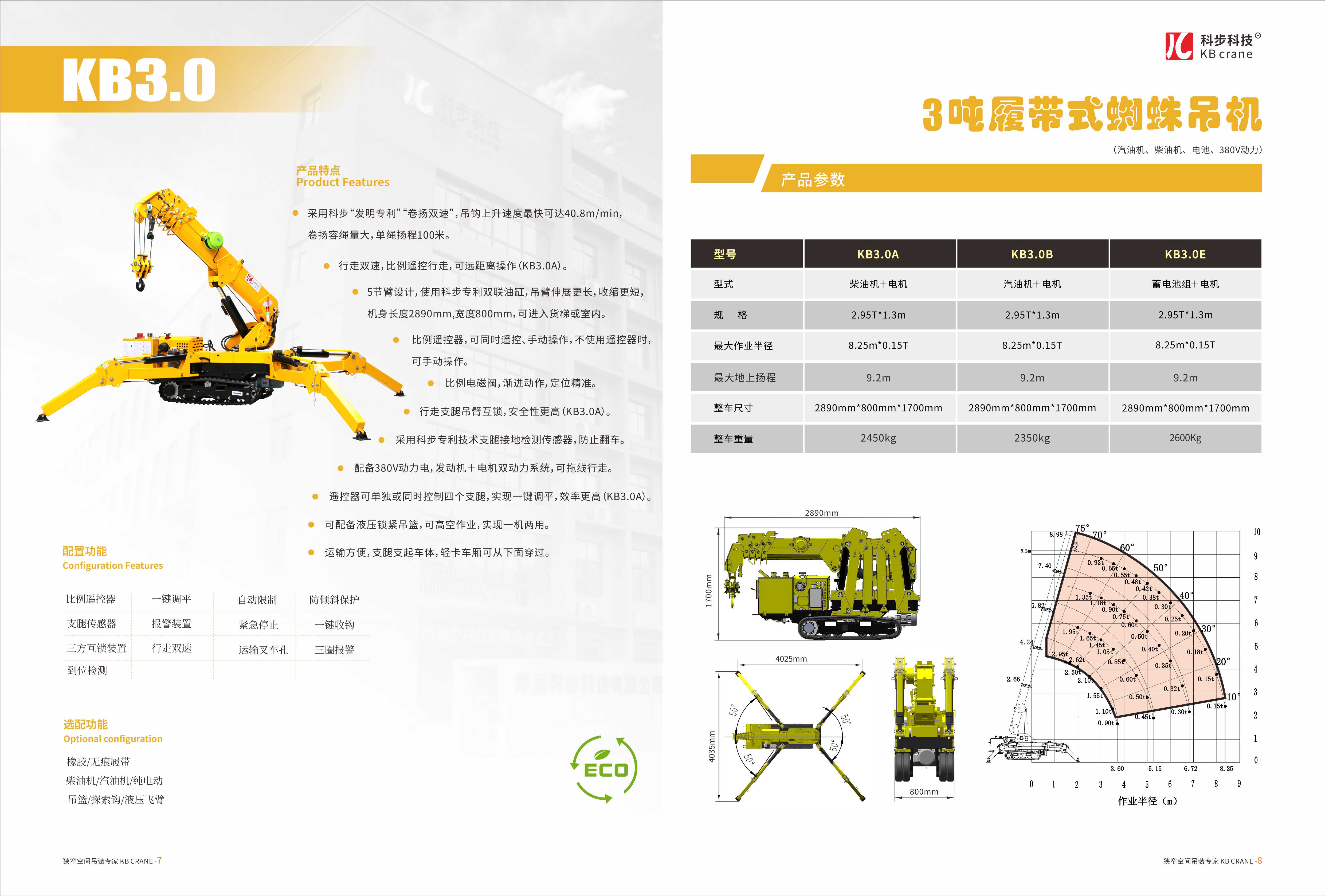 科步公司依托國外先進技術以及與鄭州市微型履帶起重機研究中心的合作,成功研發并生產了KB系列微型蜘蛛式履帶起重機包含KB1.0、KB3.0、KB5.0、KB8.0四款產品。