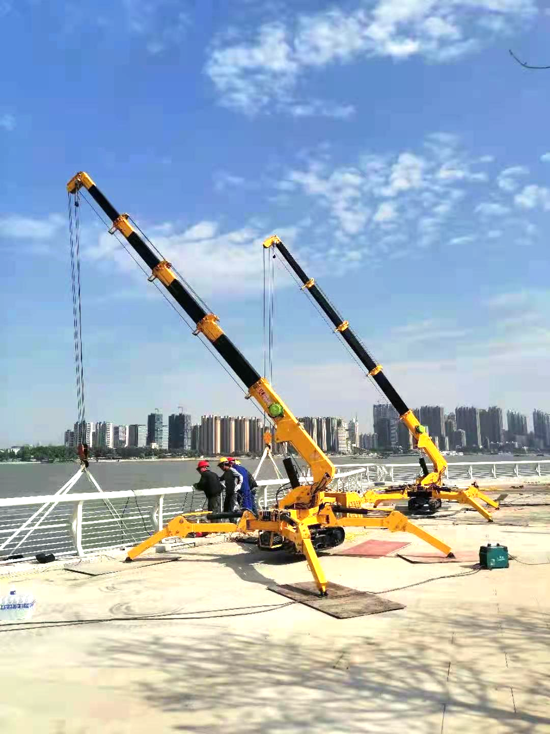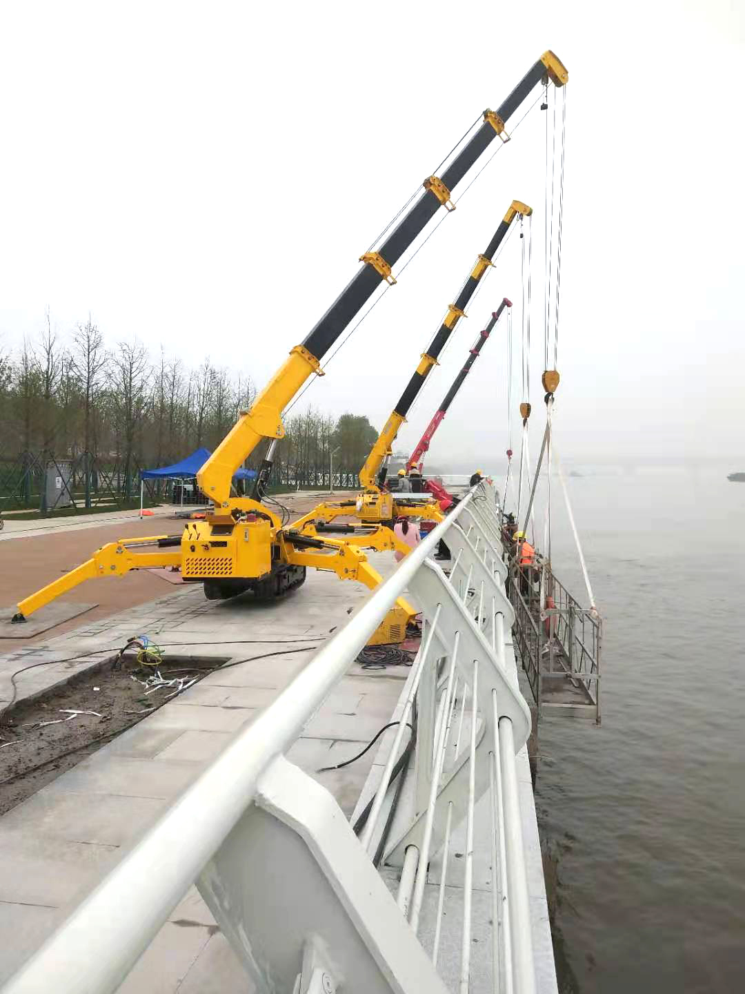 大橋橋面本身承重能力有限,尋常的起重設(shè)備由于自重過重?zé)o法使用;橋下或亂石凹凸不平或水流湍急,空間受限且非常危險,單靠人力無法完成,這就到了蜘蛛吊大顯身手的時候。